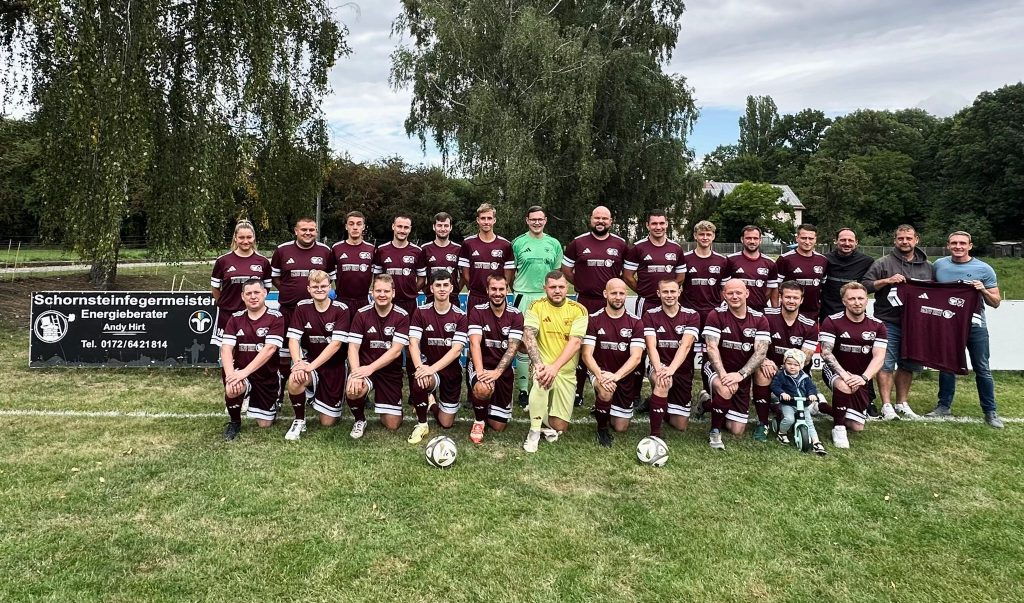 Am Samstag gab es vor dem Heimspiel gegen den SV Fortuna Brücken nun endlich die heiß ersehnten Trikots vom Schornsteinfegermeister Andy Hirt. Ganz in bordeauxrot werden die Männer um Kapitän Marian Karbe in den nächsten Wochen und Monaten nun auflaufen. „Wir haben mit der Wahl der Farbe einen guten Konsens beider Vereine gefunden.“ befand der neue Sponsorenbeauftragte der Spielgemeinschaft Patrick Schubert.