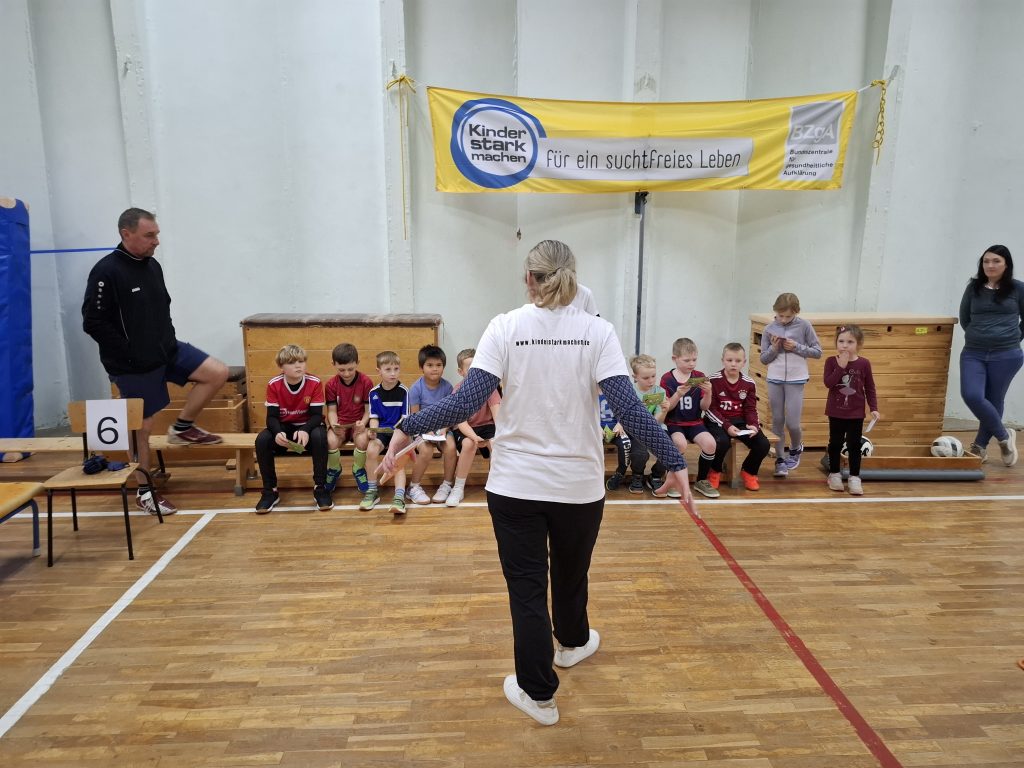 20 Kinder im Alter von 5 bis 16 Jahren fanden sich am Mittwochabend in der Sporthalle der Grundschule Welbsleben ein, um an dem von der G/F – Jugend der JSG Arnstein initiierten Aktionstag unter dem Motto „Kinder stark machen“ teilzunehmen. Neben den insgesamt sieben Stationen, die die Kids durchlaufen konnten, gab es auch reichlich Infomaterial über das Thema „Ein suchtfreies Leben“. Hier informierten sich natürlich dann mehr die Erwachsenen, die ebenfalls zahlreich gekommen sind und nahmen sich etliche Broschüren, Kalender und Spielvorlagen mit nach Hause oder gaben sie dann an Kindergärten oder Schulen weiter.